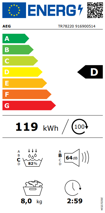 Consommation 119kWh/100 séchage Programme Coton Eco