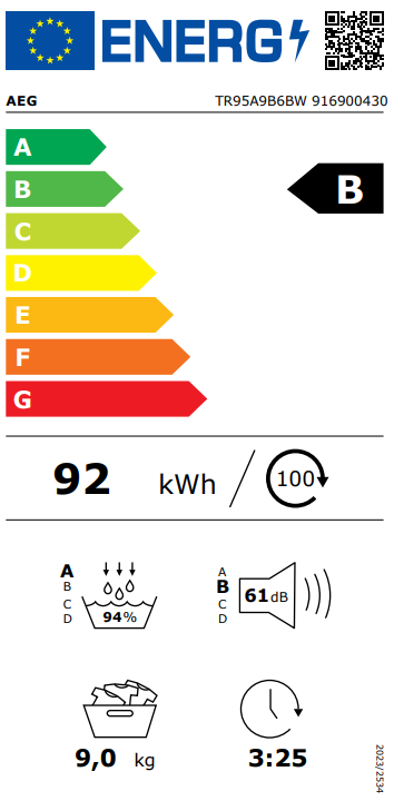 Consommation 92kWh/100 séchage Programme Coton Eco